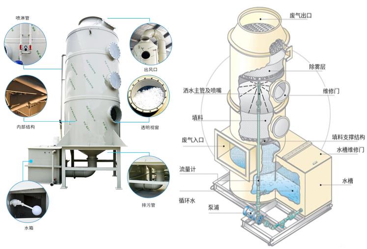 原理简述:酸碱或含尘废气通过风管引入净化塔,喷淋循环液在塔底用水泵加压后,通过防堵塞螺旋喷头将吸收剂形成雾气分子,然后通过填料层后再循环到塔底。酸碱废气和吸收液充分接触,发生酸碱中和反应,去除废气中的酸碱成分等,同时液滴还会对粉尘进行拦截,有效去除废气中的颗粒物。净化的废气经除雾器除去多余的水汽,然后进入下个处理单元进行深度处理,终由风机排放到大气中。